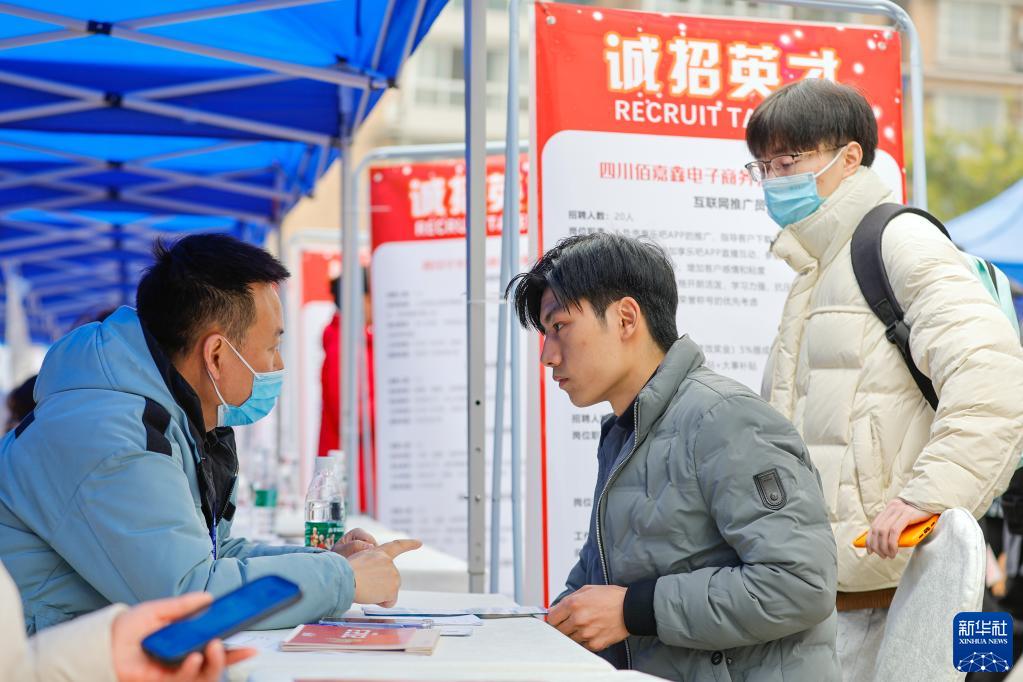 2月17日,在中國成都人力資源服務(wù)產(chǎn)業(yè)園,求職者(中)與招聘企業(yè)工作人員交流。