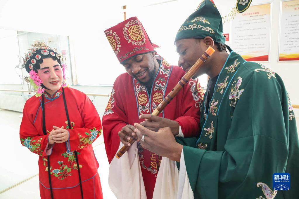2月17日,在山東省臨沂市蘭山區棗園鎮弦子戲非遺展廳,外國留學(xué)生在了解笛子的發(fā)聲原理。