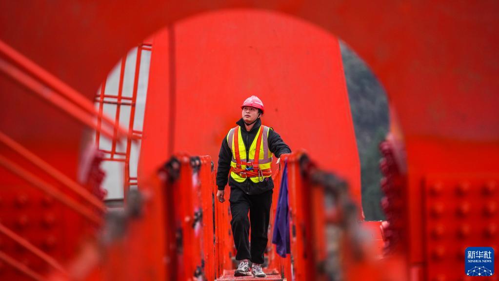 中交一公局工人在德余高速烏江特大橋橋梁上行走,前往施工點(diǎn)(2月16日攝)。