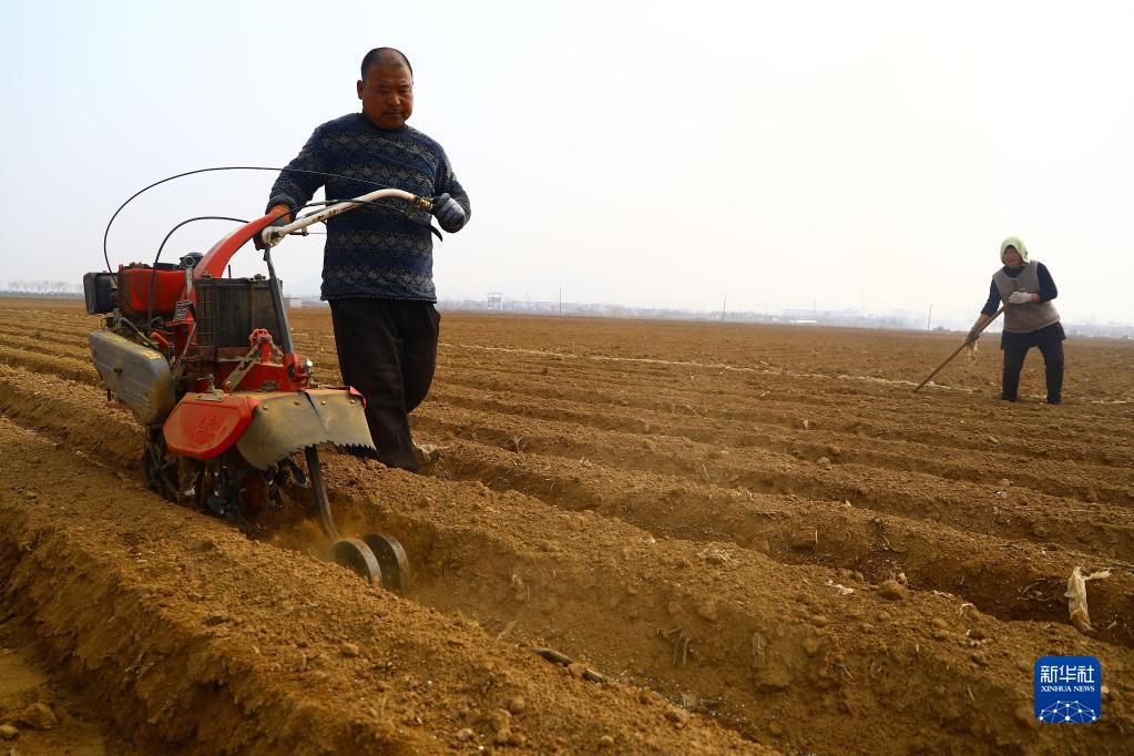 2月18日,山東省棗莊市山亭區農民在修整農田以備播種馬鈴薯。
