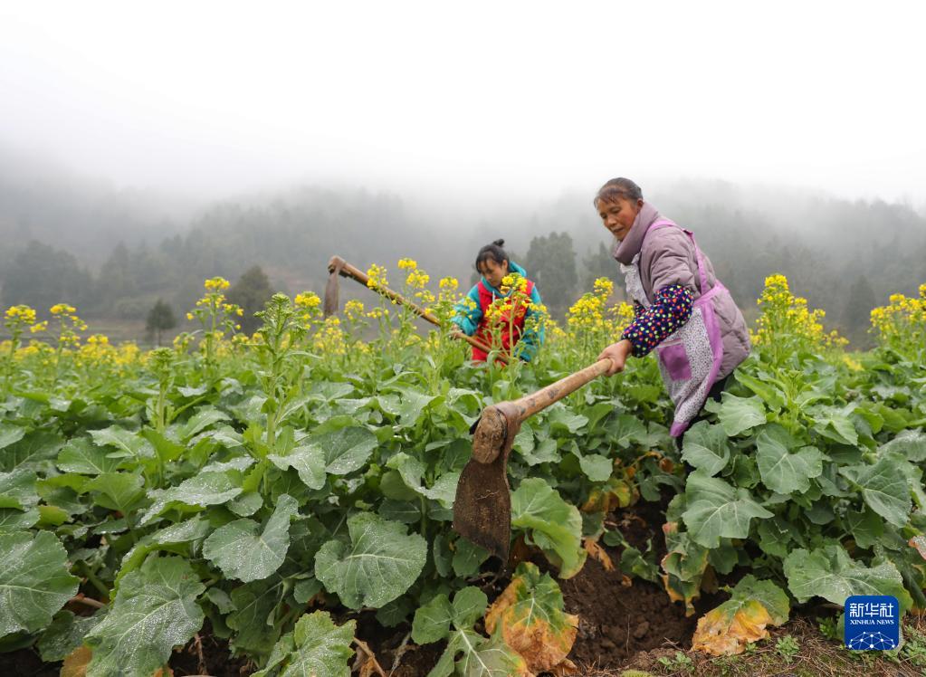 2月18日,村民在貴州省黔東南苗族侗族自治州岑鞏縣客樓鎮豐壩村油菜地里套種玉米。