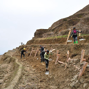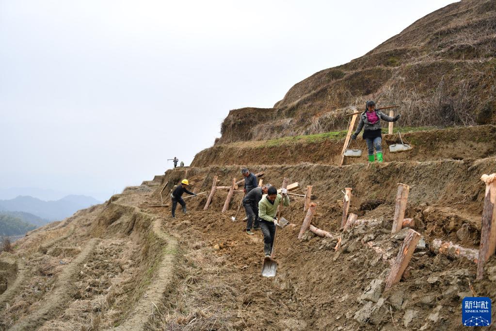 2月18日,村民在紫鵲界梯田夯實(shí)梯壁。