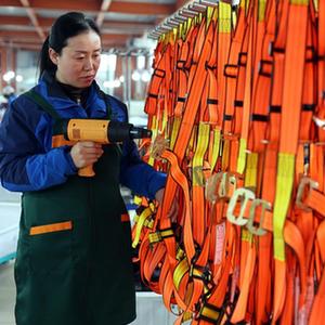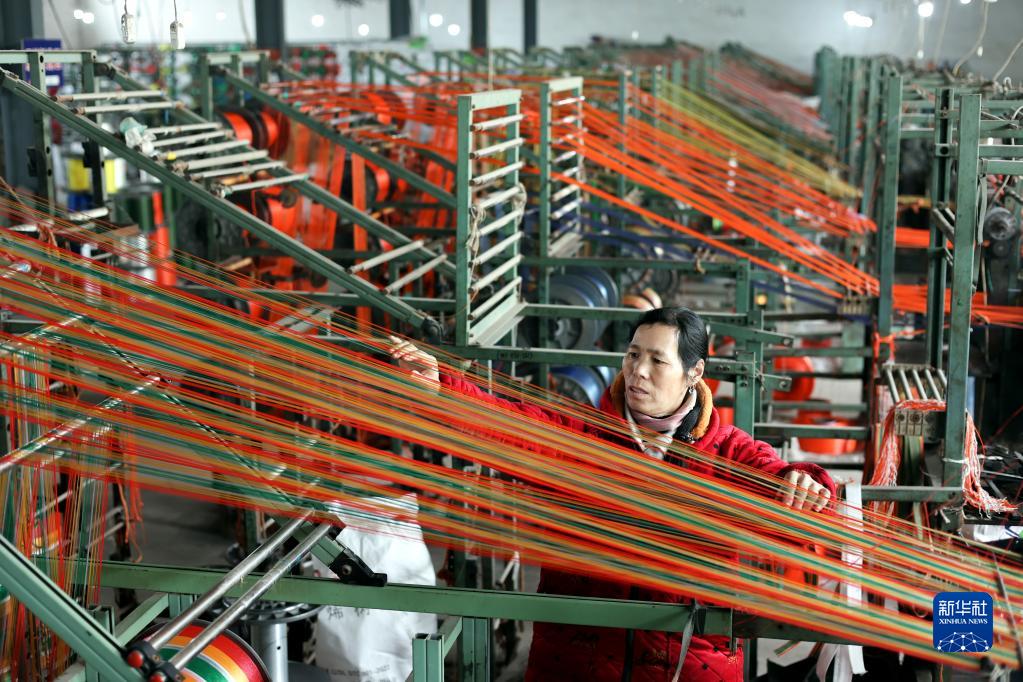 2月18日,山東省濱州市惠民縣姜樓鎮一家繩網(wǎng)企業(yè)工人在趕制一批來(lái)自國外的安全帶訂單。