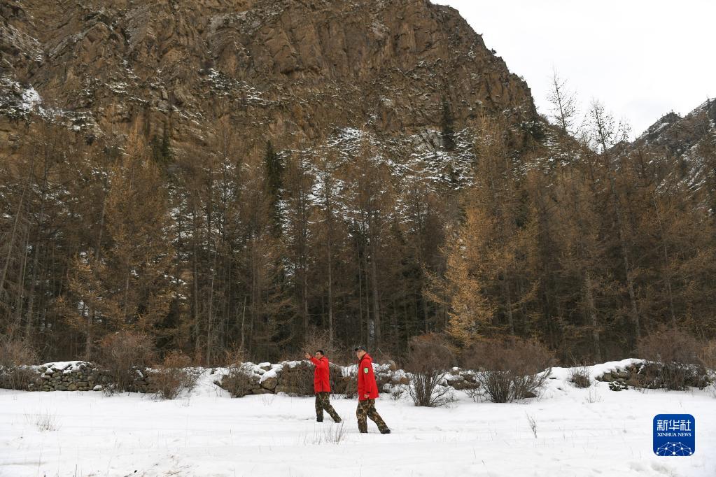 2月17日,哈拉烏管理站副站長(cháng)李東(左)與管護員達來(lái)在保護區內巡護。