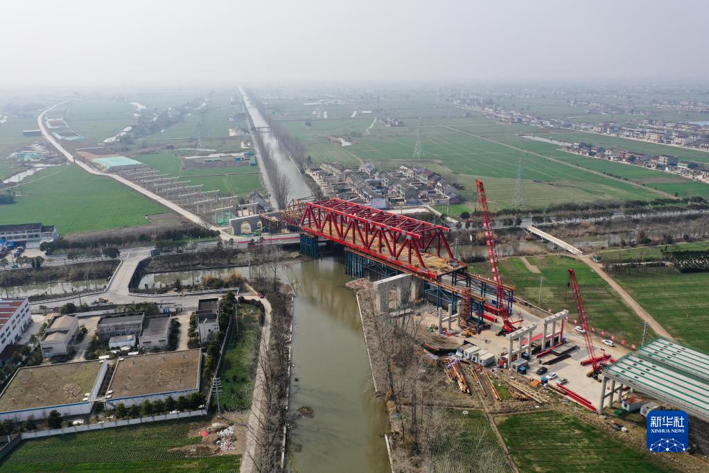 2月19日拍攝的中鐵二十局常泰長(cháng)江大橋南北公路接線(xiàn)工程跨G345特大橋鋼桁梁頂推作業(yè)現場(chǎng)(無(wú)人機照片)。