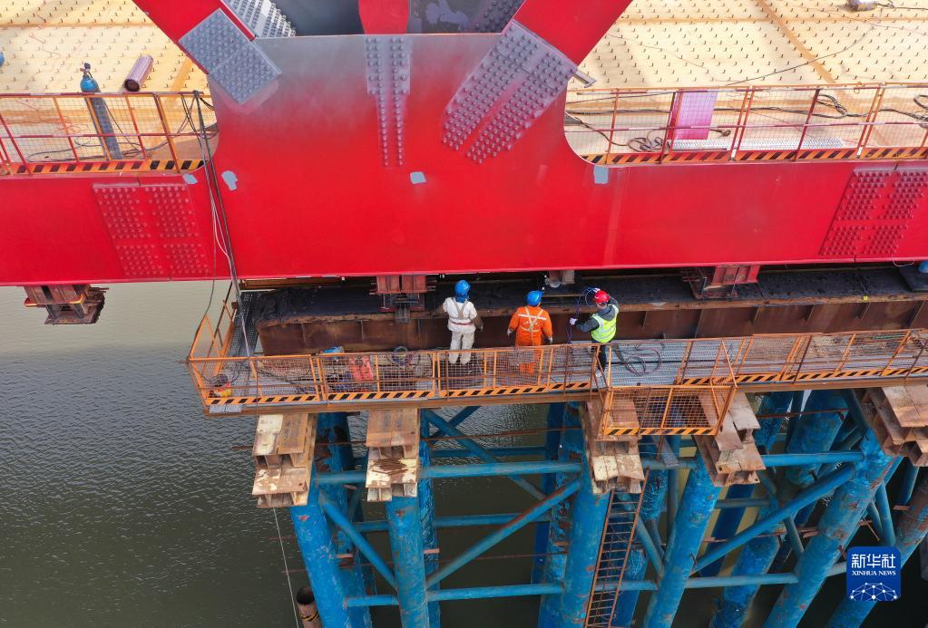 2月19日,中鐵二十局施工人員在常泰長(cháng)江大橋南北公路接線(xiàn)工程跨G345特大橋鋼桁梁頂推作業(yè)現場(chǎng)忙碌(無(wú)人機照片)。