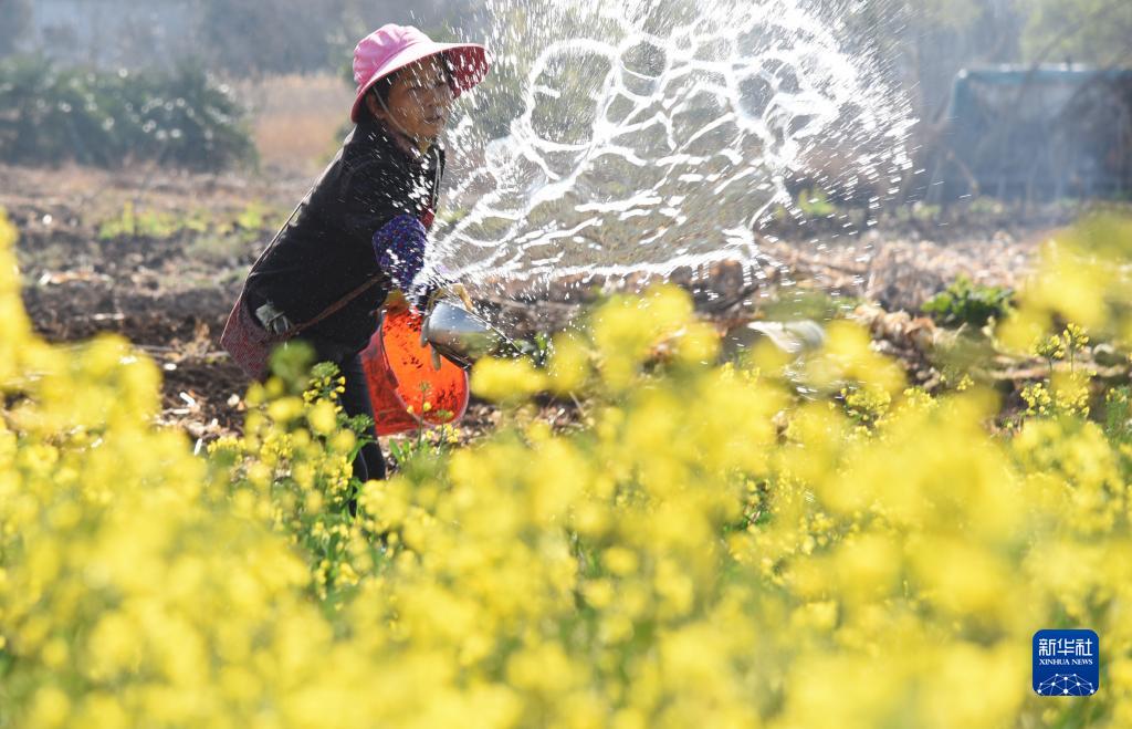 2月19日,在云南省麗江市玉龍納西族自治縣黃山街道的農田里,菜農在澆水。