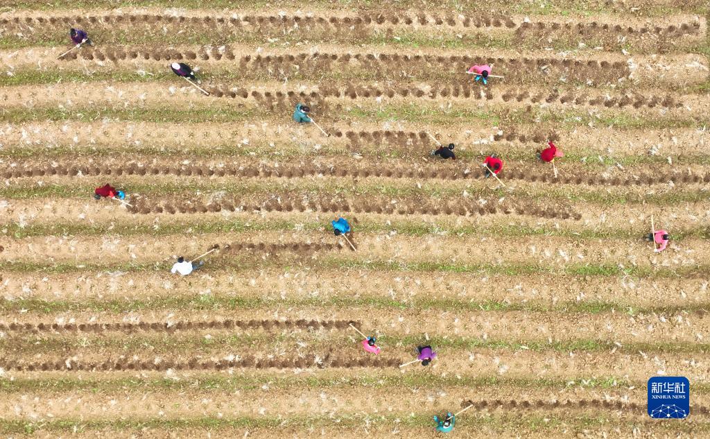 2月19日,在湖南省衡陽(yáng)市祁東縣白地市鎮,村民在田間勞作(無(wú)人機照片)。