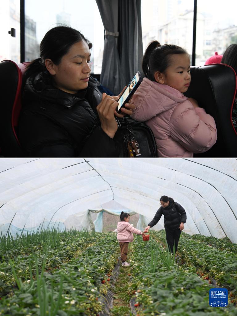 這是一張拼版照片:上圖為2月18日,家長(cháng)(左)帶著(zhù)孩子乘坐“草莓采摘”定制公交準備前往馬郢社區采摘草莓;下圖為2月18日,家長(cháng)(右)和孩子一起在馬郢社區采摘草莓。