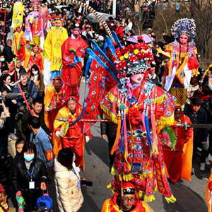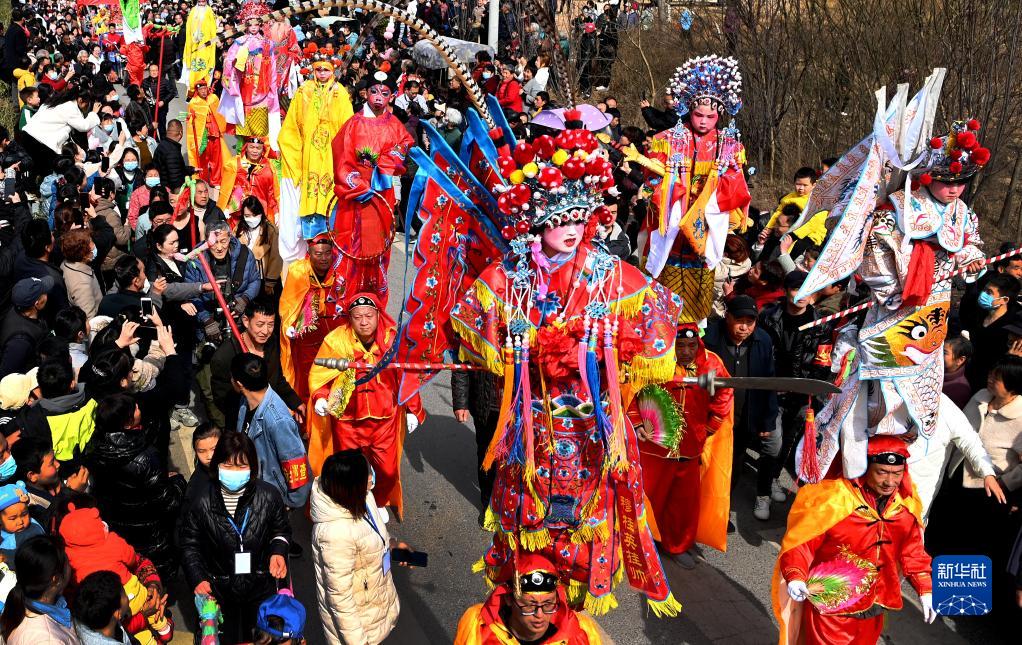 當日是農歷正月二十九,陜西省西安市臨潼區櫟陽(yáng)街道卷子村舉行“背芯子”表演,吸引了許多群眾前來(lái)觀(guān)看?!氨承咀印笔侵袊耖g社火表演的一種,背桿用特制的鐵架子綁在背者身上,上端站有四五歲的兒童,按照故事內容扮成不同的人物。背者加上上端兒童高達三米多,隨著(zhù)鼓點(diǎn)踏著(zhù)碎步進(jìn)行表演。