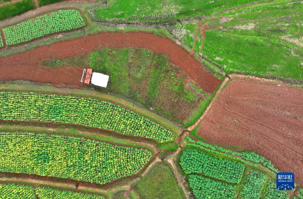 2月19日,在湖南省衡陽(yáng)市祁東縣過(guò)水坪鎮,村民駕駛農機翻耕土地(無(wú)人機照片)。