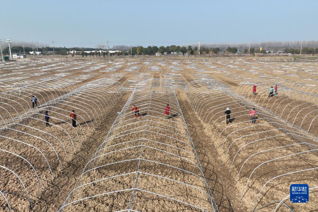 2月20日,在江蘇省淮安市食品科技產(chǎn)業(yè)園,工人們在建設蔬菜大棚(無(wú)人機照片)。