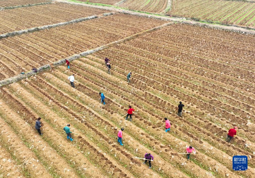 2月19日,在湖南省衡陽(yáng)市祁東縣白地市鎮,村民在田間勞作(無(wú)人機照片)。