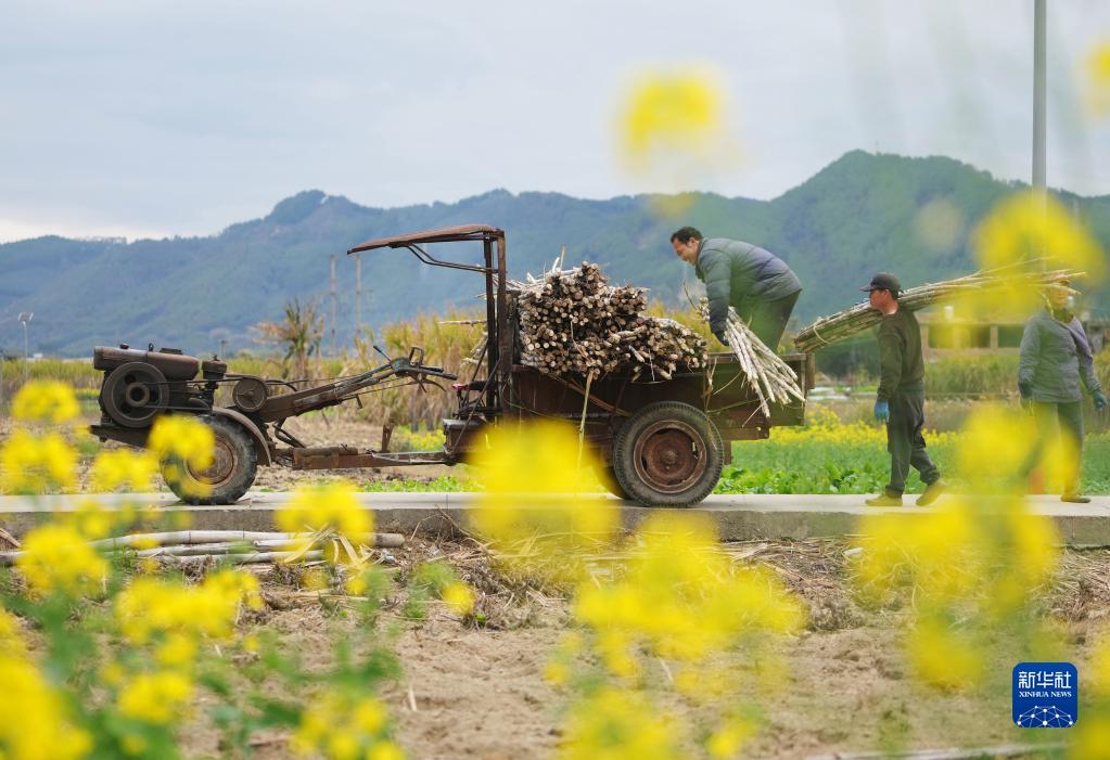 2月19日,在廣西柳州市融水苗族自治縣融水鎮下廓村中麻屯,村民搬運糖料蔗。