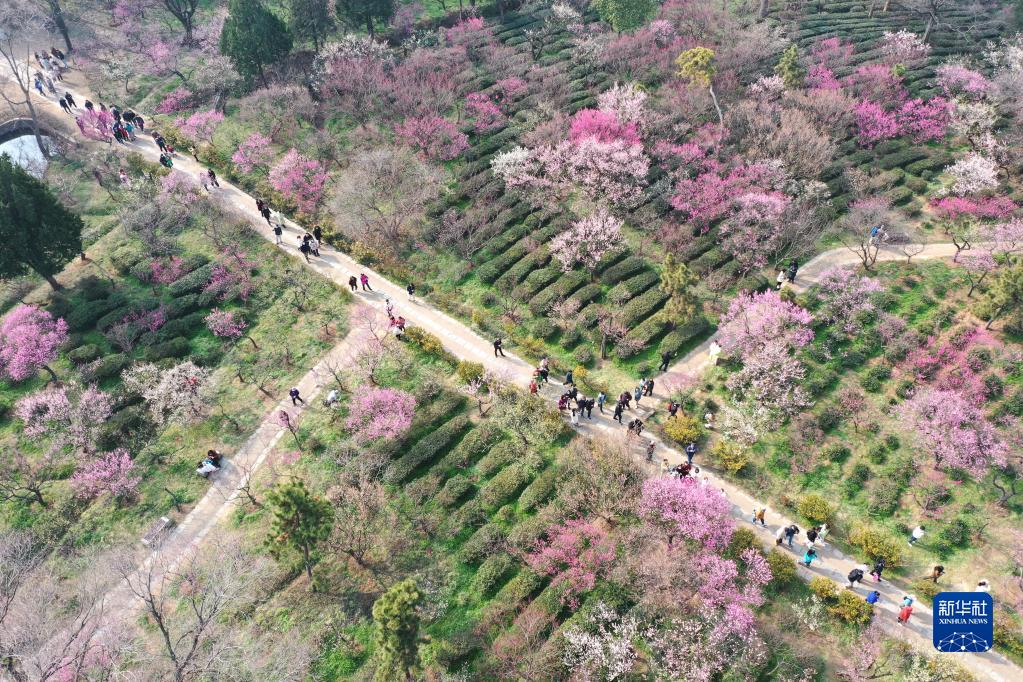 2月19日,人們在南京梅花山賞花游玩(無(wú)人機照片)。
