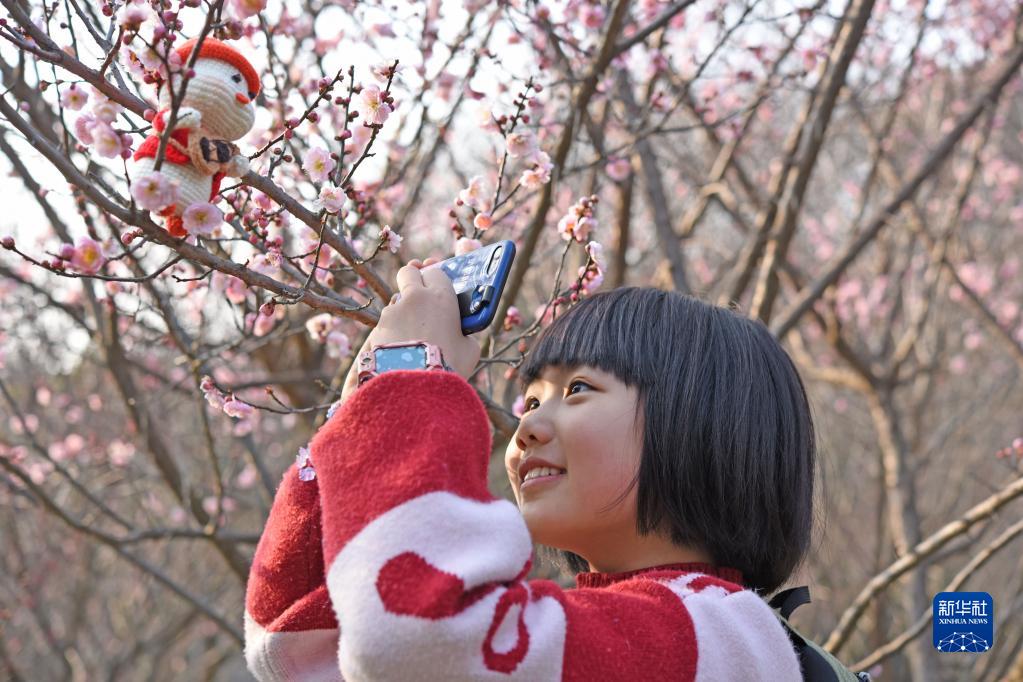 2月19日,小學(xué)生在安徽淮南市舜耕山風(fēng)景區梅園內拍照。