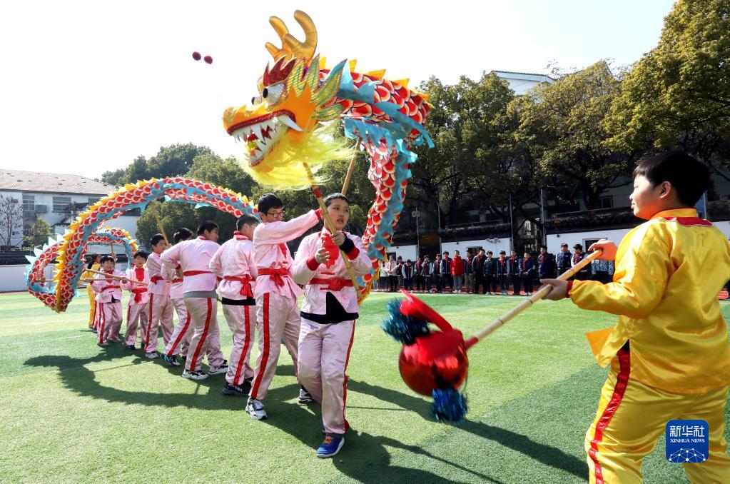 2月20日,江蘇省蘇州市昇平實(shí)驗小學(xué)校學(xué)生表演舞龍,迎接“二月二”。