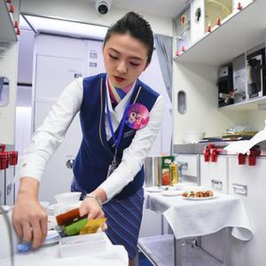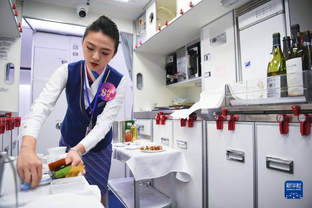 2月20日,參賽乘務(wù)員在中國南航廣州產(chǎn)教融合實(shí)訓基地的客艙模擬器中準備食物,參加服務(wù)實(shí)操考核。
