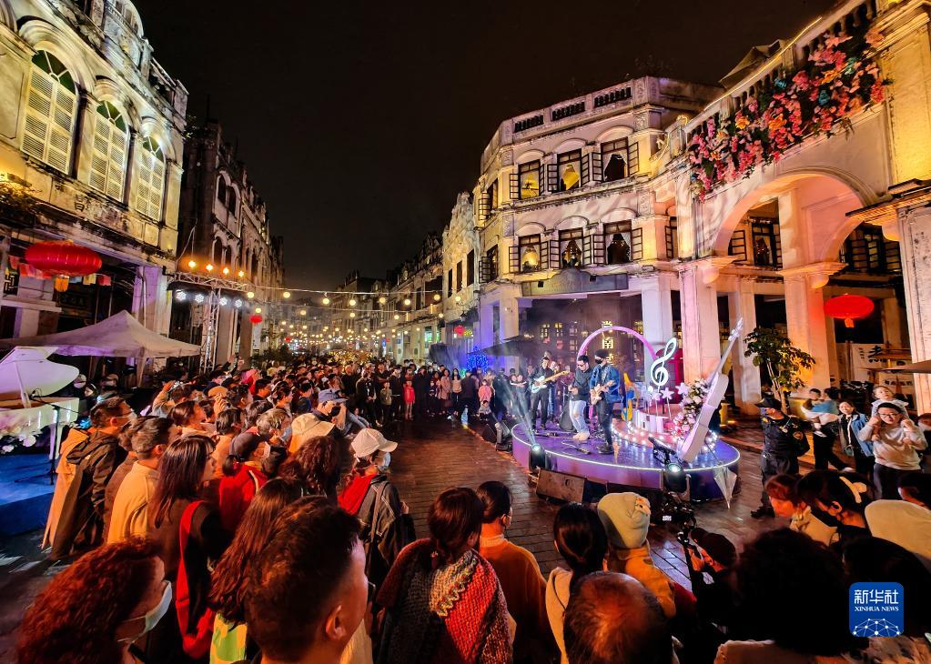 游客在??隍T樓老街的中西合璧市集觀(guān)看樂(lè )隊演出(2月3日攝)。