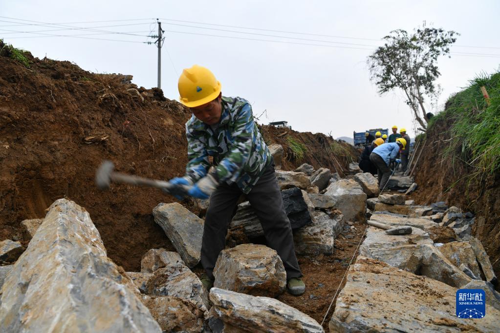 2月20日,施工隊員在湖南省湘西土家族苗族自治州花垣縣花垣鎮巖壩塘村修建水渠。