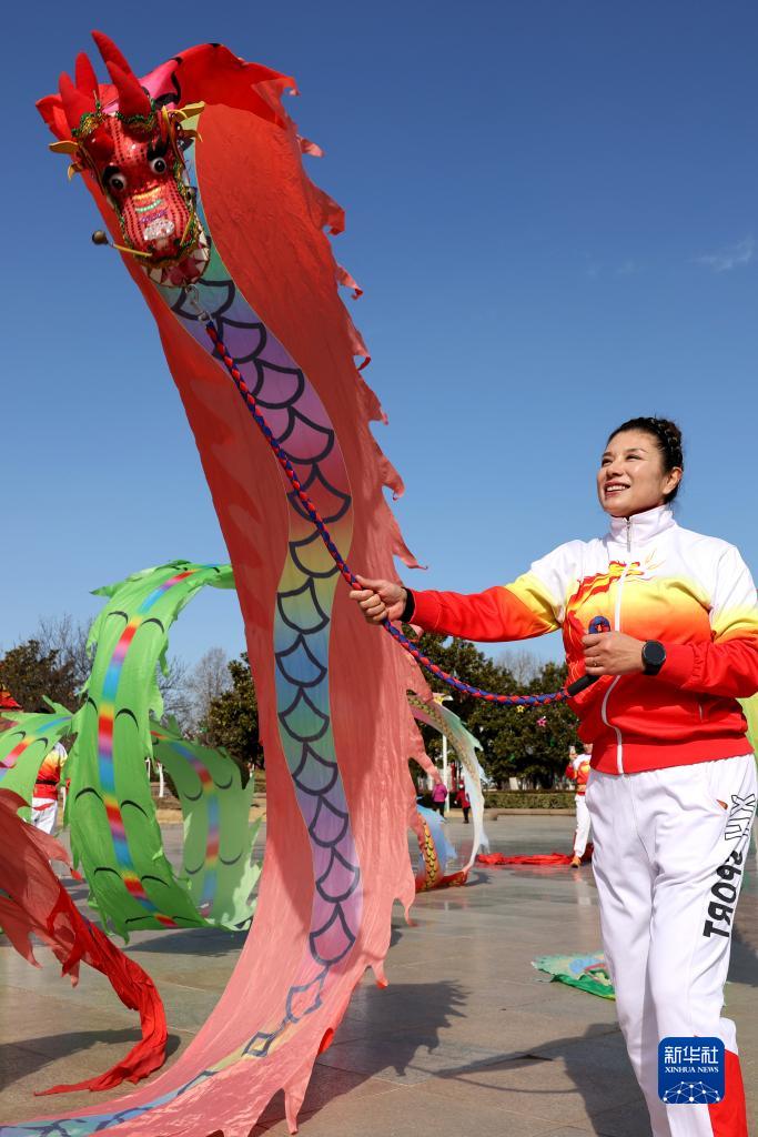 2月21日,山東省棗莊市稅郭鎮的“彩帶龍”愛(ài)好者在舞彩龍。