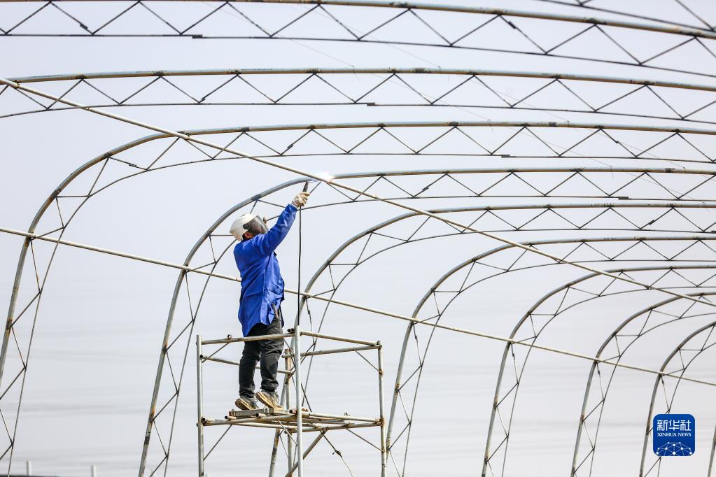 2月20日,工人在瑞昌市賽湖農場(chǎng)三分場(chǎng)建設智慧大棚。