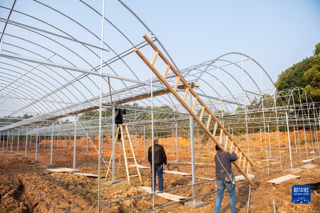 2月21日,在醴陵市東富鎮東富村,村民在搭建育秧大棚。