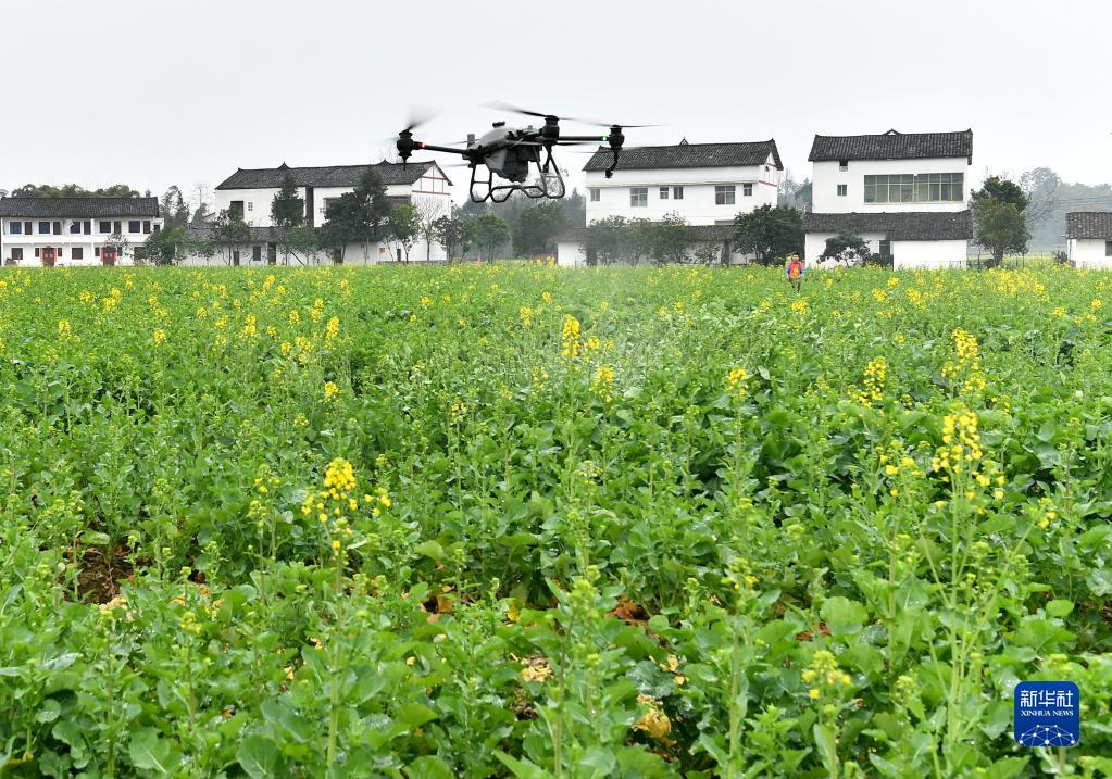 2月21日,在四川省廣安市廣安區花橋鎮花橋村,農戶(hù)操作植保無(wú)人機給油菜施肥。