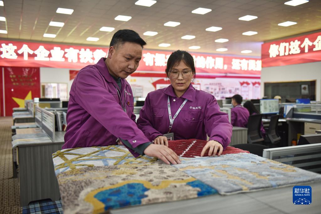 2月21日,在西寧市圣源地毯集團有限公司生產(chǎn)車(chē)間,兩名藏毯設計師在對比藏毯樣品。
