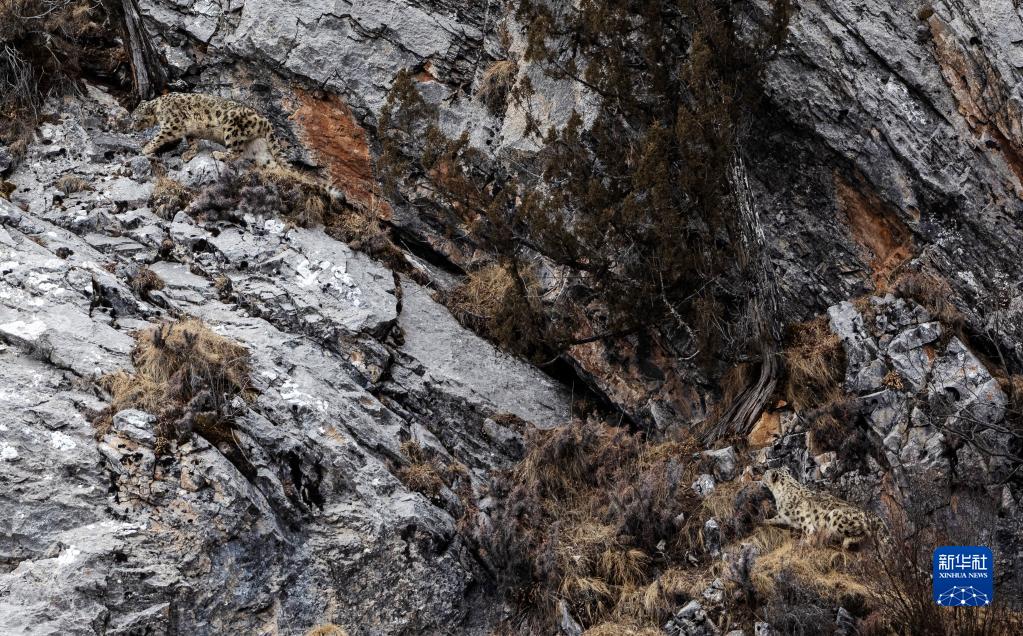 2月21日,在青海省玉樹(shù)藏族自治州雜多縣昂賽鄉境內的昂賽大峽谷內,兩只雪豹在向上攀爬。