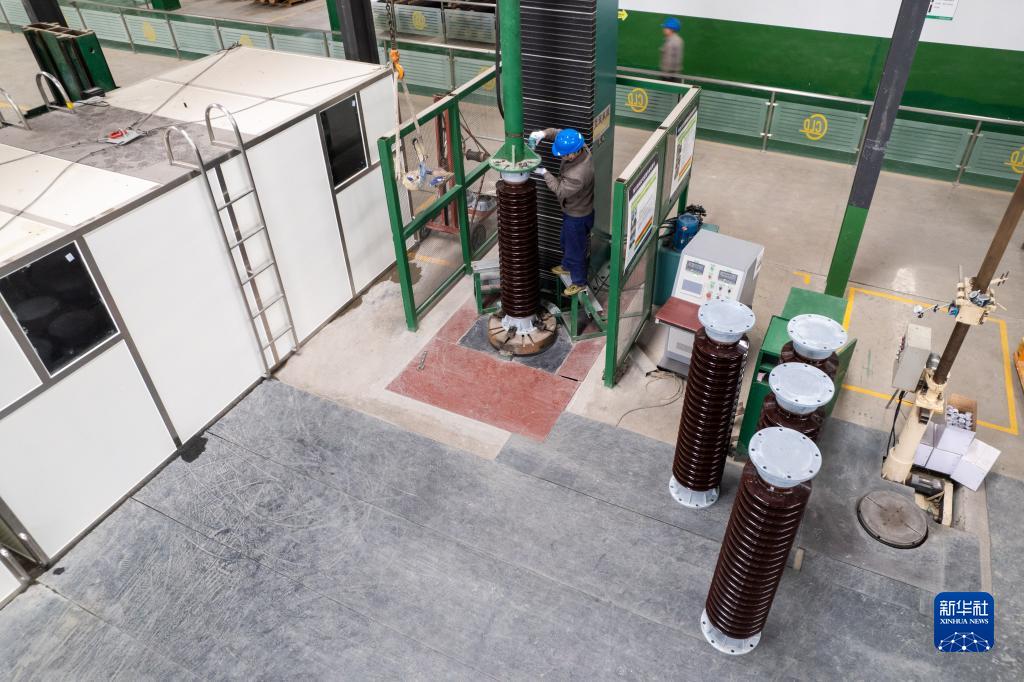 2月22日,在位于醴陵市的湖南陽(yáng)東電瓷電氣股份有限公司生產(chǎn)車(chē)間,工作人員在檢測瓷絕緣子的力學(xué)性能(無(wú)人機照片)。