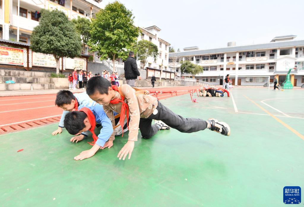 2月22日,廣西蒙山縣夏宜民族學(xué)校學(xué)生在體育課上進(jìn)行“大象拔河”。