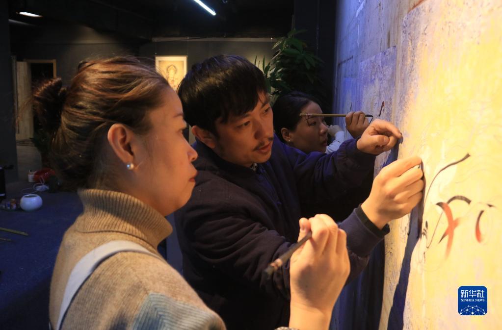 2月22日,在敦煌小鎮鳴沙書(shū)院,藝術(shù)工作者張杰龍(中)指導學(xué)員臨摹敦煌壁畫(huà)。