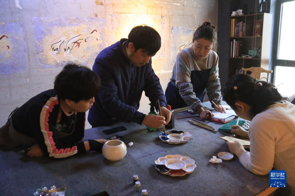 2月22日,在敦煌小鎮鳴沙書(shū)院,藝術(shù)工作者張杰龍(中)指導學(xué)員進(jìn)行顏料調色。
