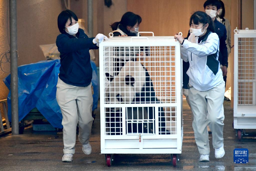 2月22日,在日本和歌山縣白浜町的“冒險世界”樂(lè )園,工作人員運送大熊貓“永明”。