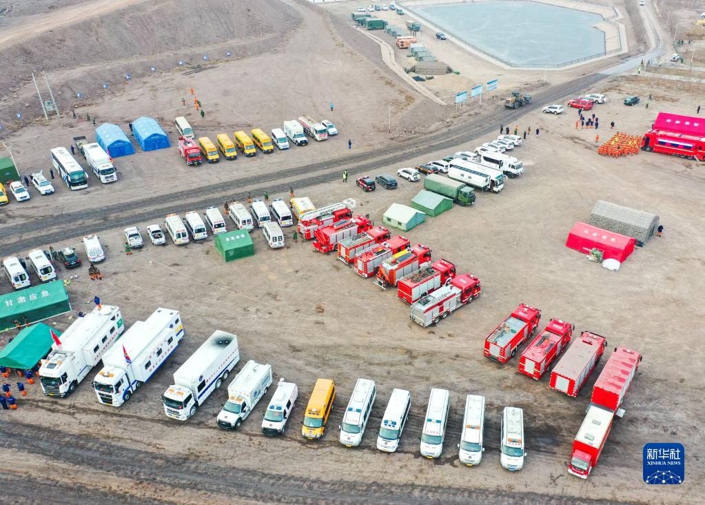 2月23日,救援車(chē)輛在內蒙古自治區阿拉善盟阿拉善左旗新井煤業(yè)有限公司露天煤礦坍塌事故現場(chǎng)附近待命(無(wú)人機照片)。