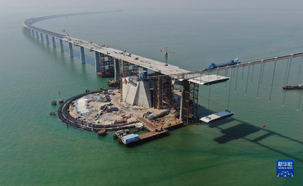 這是2月22日拍攝的正在吊裝鋼箱梁的深中通道伶仃洋大橋邊跨(無(wú)人機照片)。