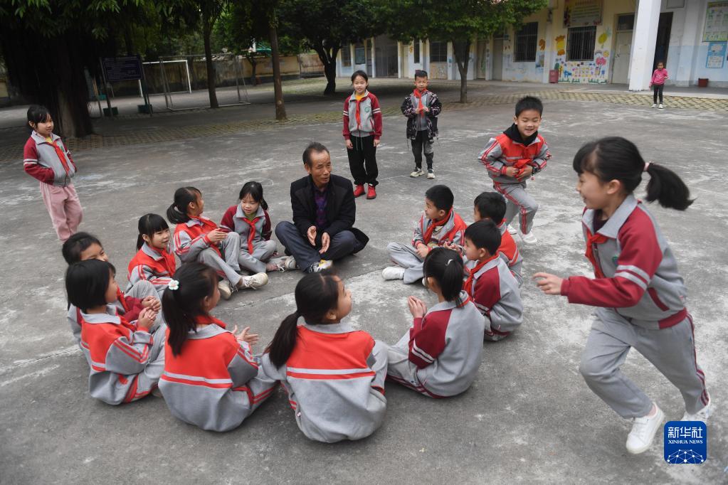 在廣西賓陽(yáng)縣王靈鎮中心學(xué)校七新教學(xué)點(diǎn),王英紅老師課間和學(xué)生做游戲(2月22日攝)。