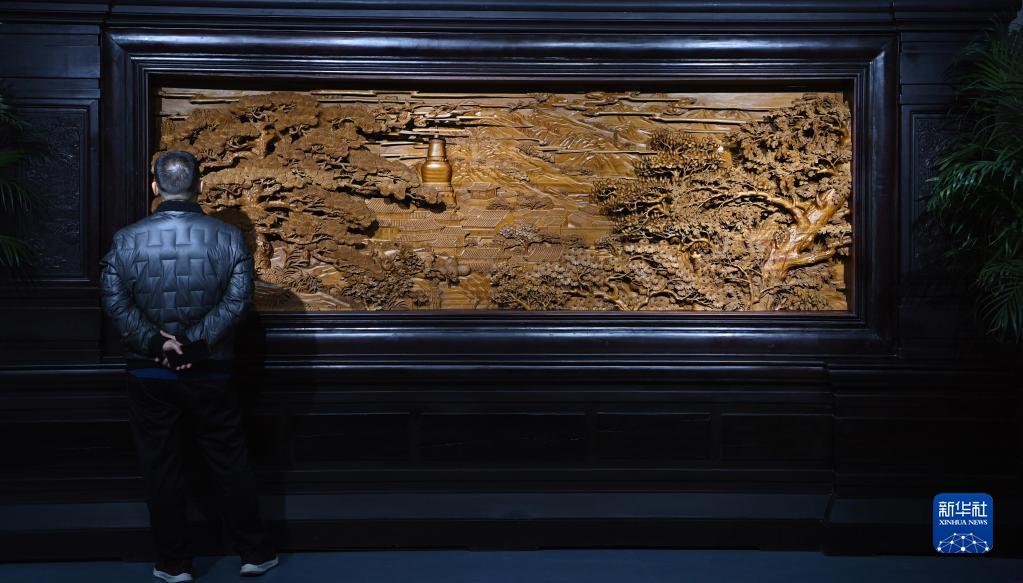 2月23日,市民在太原市文化館參觀(guān)“木里千秋·雕繪春景——晉作木雕作品展”。