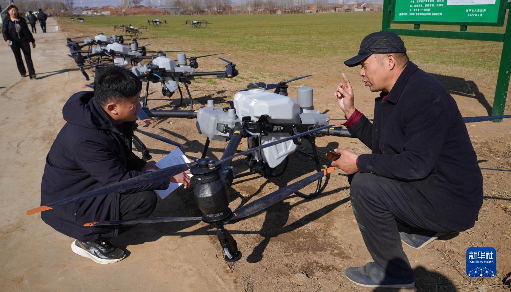 2月23日,在鄒平市長(cháng)山鎮八方農場(chǎng)活動(dòng)現場(chǎng),農民參觀(guān)飛防設備。