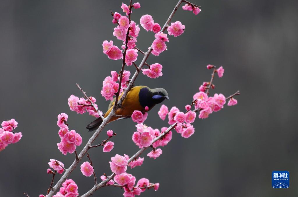 2月23日,在張家界市武陵源區黃龍洞景區,一只小鳥(niǎo)在花枝上停留。