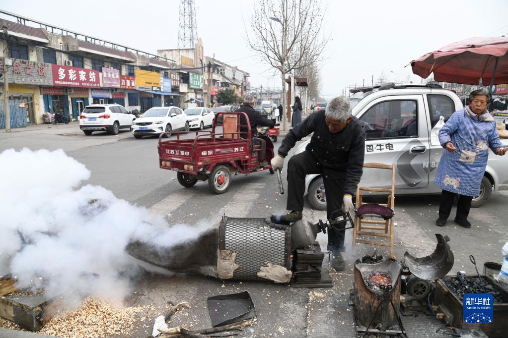 2月23日,在河南省濟源市五龍口鎮尚莊村集市上,商販在崩爆米花。