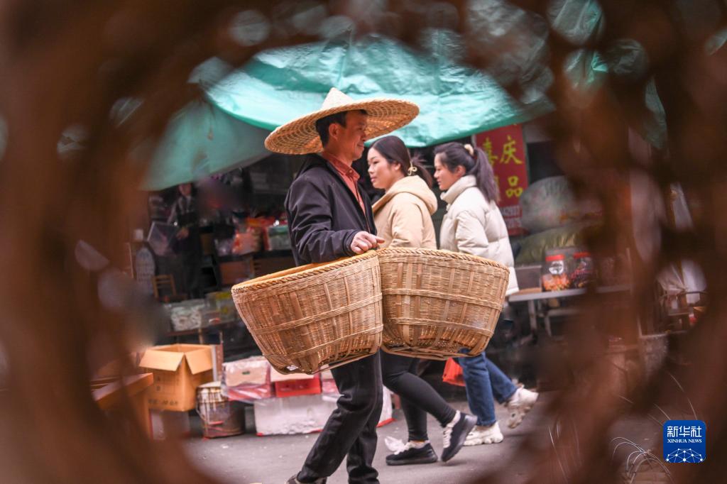 2月23日,湖南省常寧市勝橋鎮群眾帶著(zhù)新買(mǎi)的斗笠和籮筐從集市上走過(guò)。