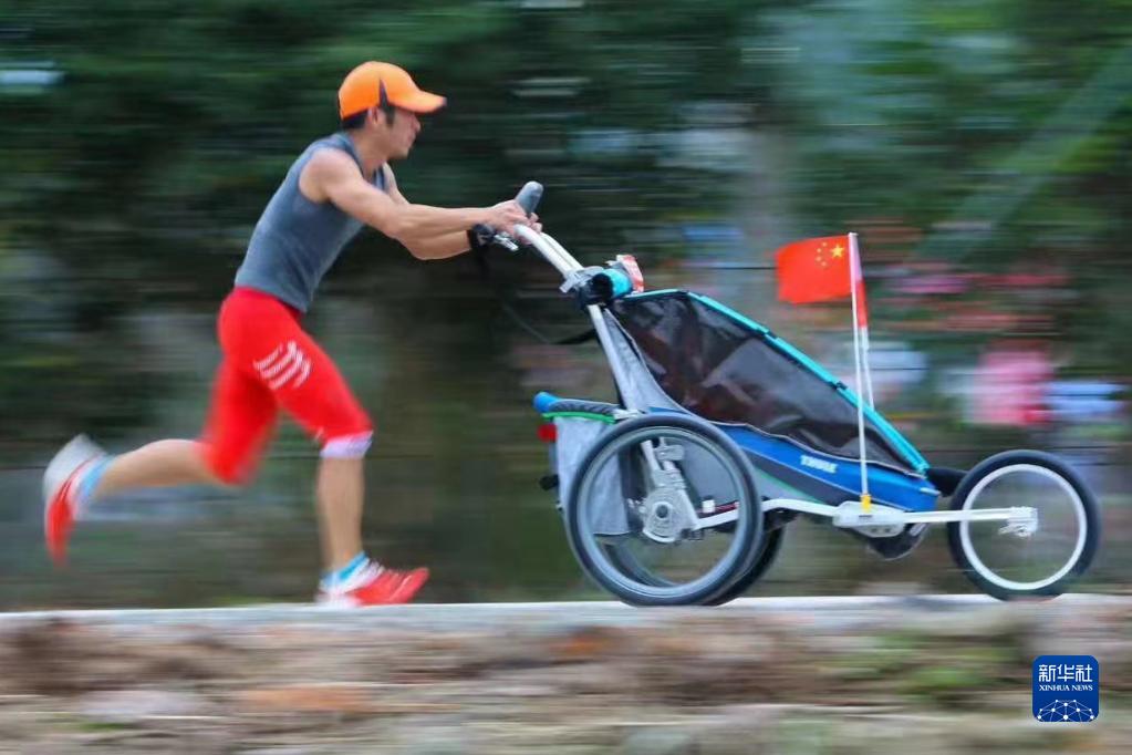 羅書(shū)堅推著(zhù)兒子小柏參加浙江仙居馬拉松(2019年12月1日攝)。