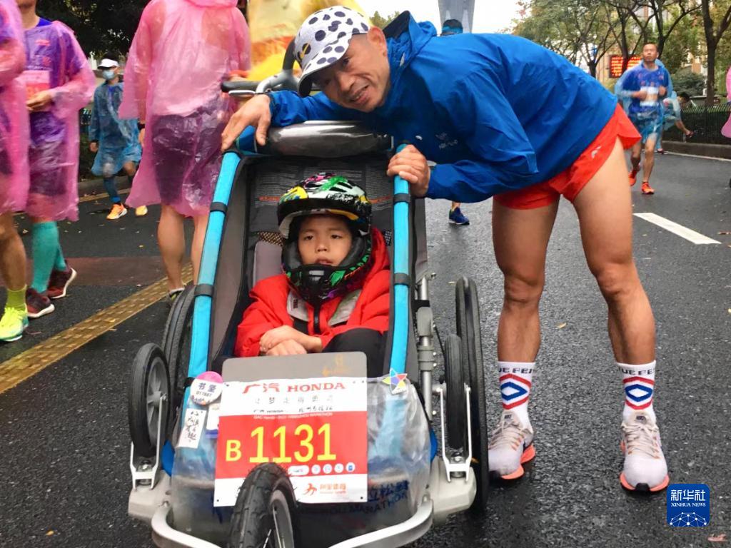 羅書(shū)堅推著(zhù)兒子小柏參加完杭州馬拉松后留影(2020年11月22日攝)。
