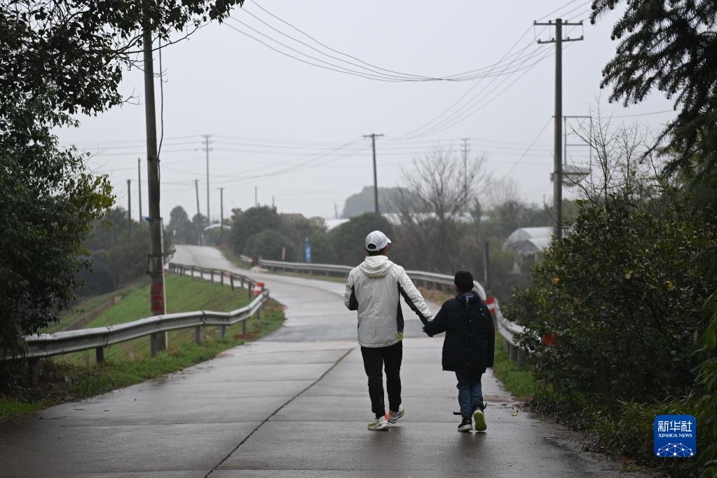 2月24日,羅書(shū)堅(左)牽著(zhù)兒子小柏在浙江省金華市婺城區羅店鎮三甲山村附近散步。