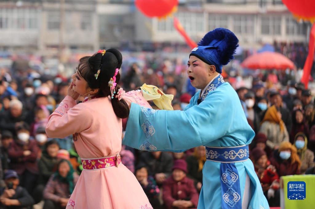 2月24日,戲曲演員在臨沂市沂南縣依汶鎮東依汶村為村民演出呂劇《喝面葉》。