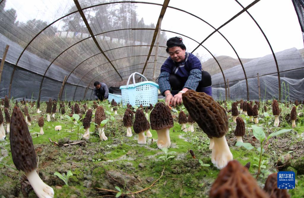 2月24日,貴州省黔東南苗族侗族自治州榕江縣古州鎮寨頭村,村民在采收羊肚菌。