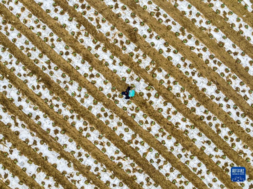2月24日,村民在貴州省安順市關(guān)嶺布依族苗族自治縣斷橋鎮壩陵村蔬菜基地勞作(無(wú)人機照片)。