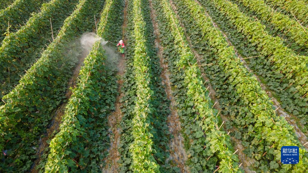2月24日,海南省瓊海市嘉積鎮的農民為冬瓜滅蟲(chóng)(無(wú)人機照片)。